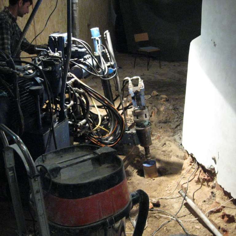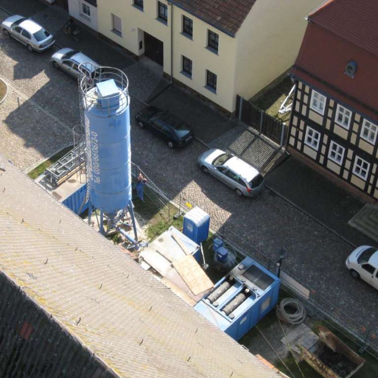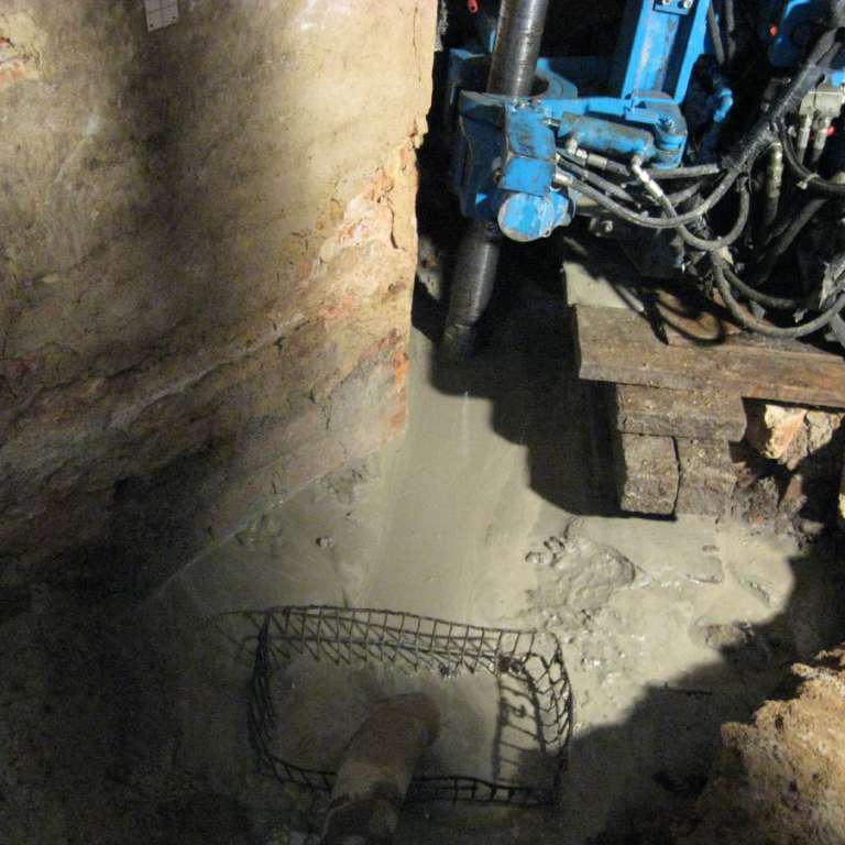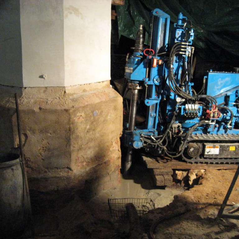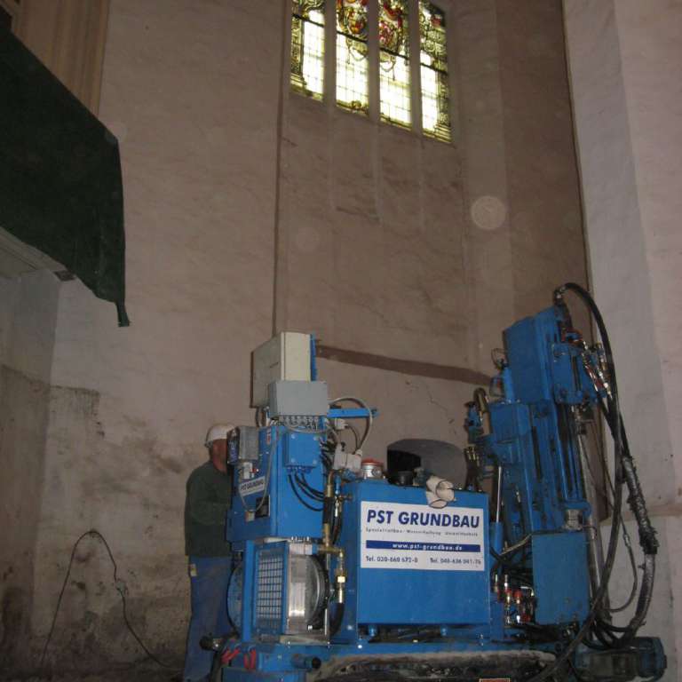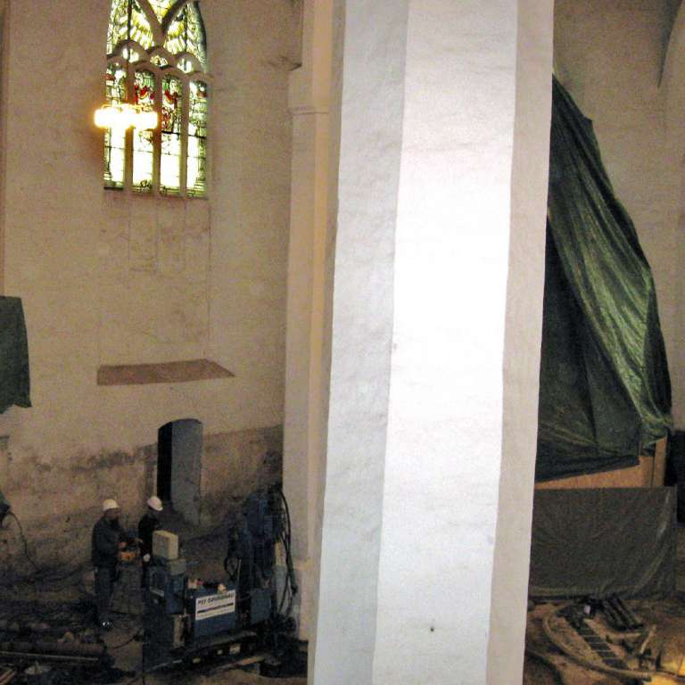 Wir führten insgesamt 600 Kubikmeter Unterfangung als Hochdruckbodenvermörtelung PREUSSAG-JET aus, davon ca. 180 Kubikmeter mit Kellerbohrgeräten im Innenraum der Kirche.