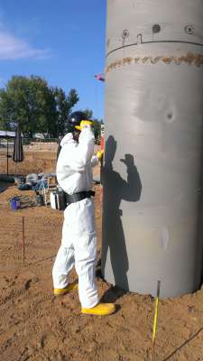 Begleitet wurden die Aushubarbeiten durch eine Luftabsaugung an jeder Wabe bzw. an jedem Bohrloch mit einer Luftleistung von >500 m³/h je Ansaugstelle. Ebenso wurden die während der Befüllung offenen Deckelcontainer an die Luftabsaugung und –reinigung angeschlossen. Die Abluftreinigung erfolgte einsatzortbezogen mittels mehrerer mobiler Einheiten jeweils bestehend aus einem Radiallüfter mit Q=1.500 m³/h, einem Arbeitsfilter und einem nachgeschalteten Polizeifilter mit jeweils 2.000 Litern Luftaktivkohle. Zwischen Arbeits- und Polizeifilter befand sich die Qualitätsmessstrecke der wöchentlichen Eigenüberwachung.