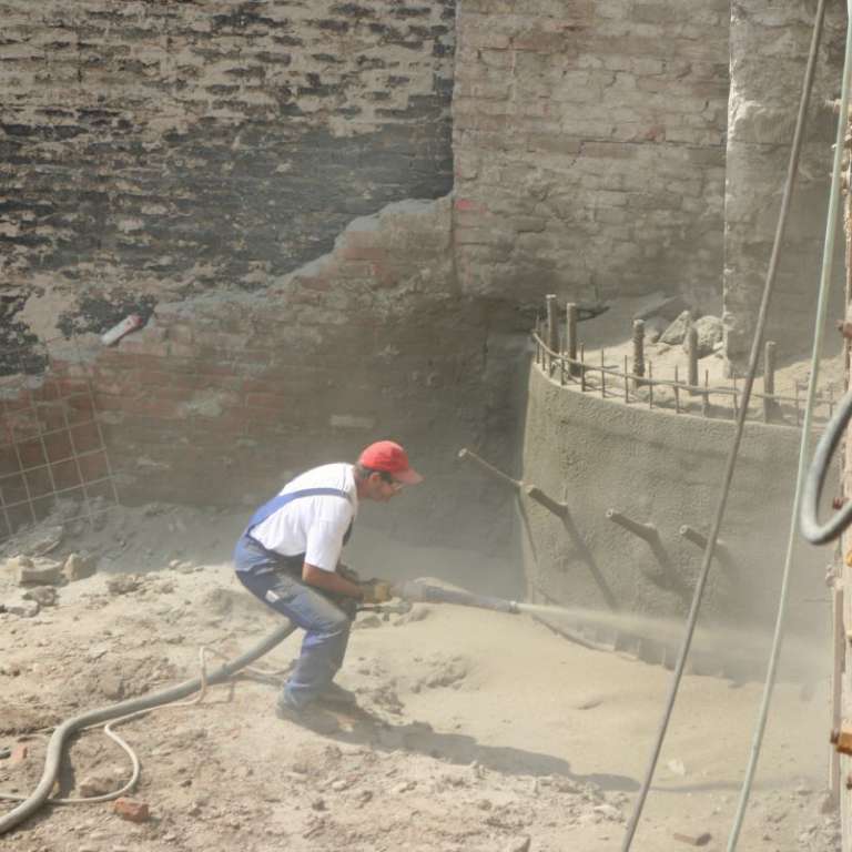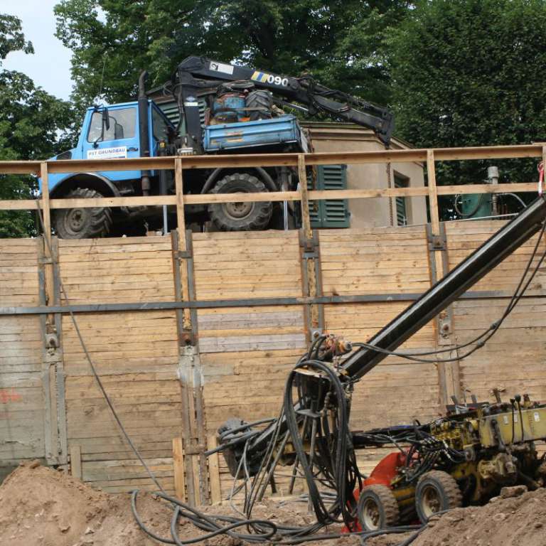 Ausgeführt werden ein Berliner Verbau mit Verankerung, Niederdruckinjektionen und vernagelte Spritzbetonwände.