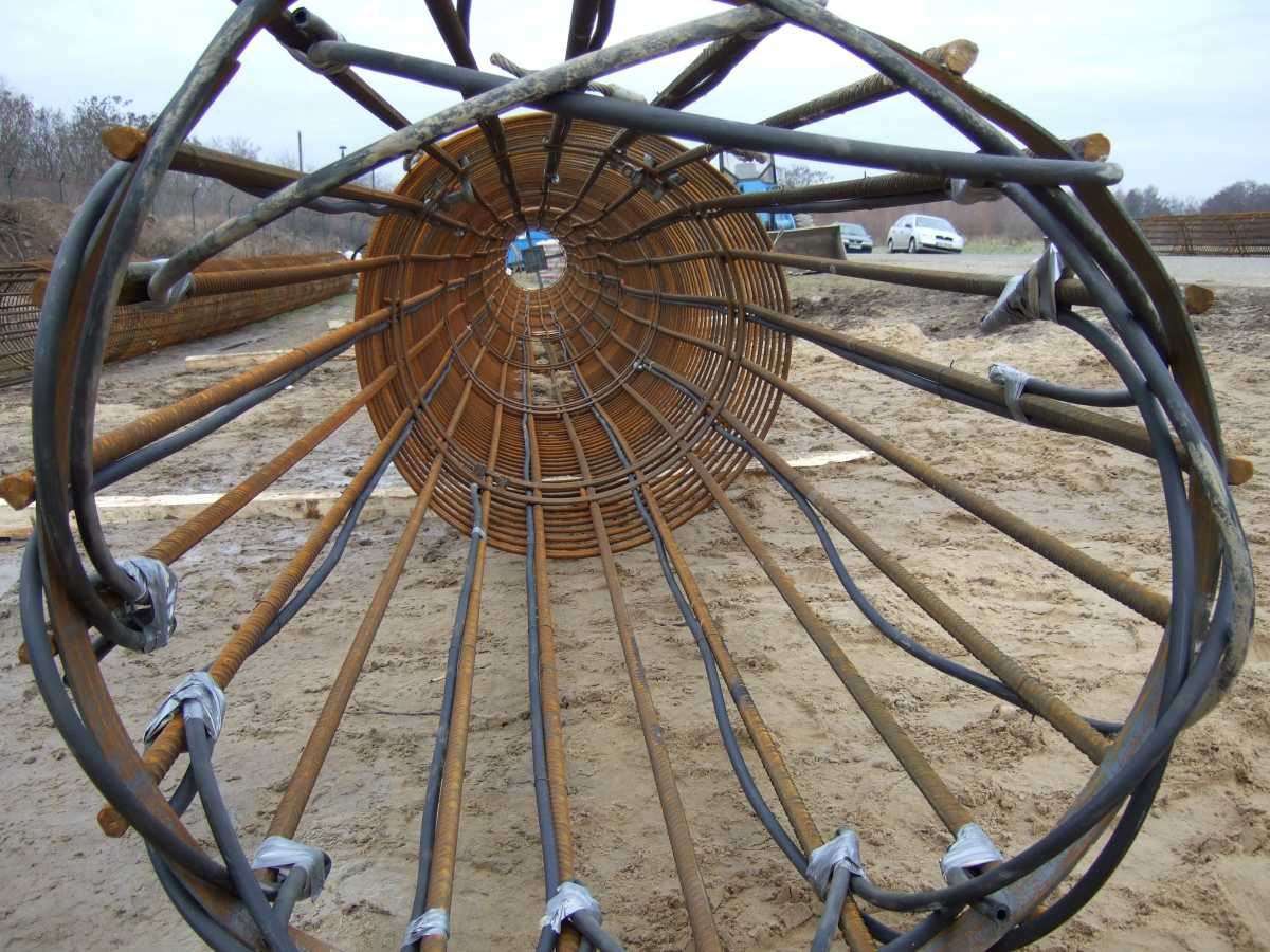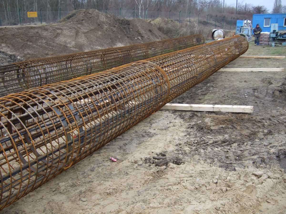 Auf Bild 1 ist dargestellt, wie mit dem Hilfsseil der Drehbohranlage und Unterstützung eines Radladers der mehr als 20,00 m lange Bewehrungskorb für den Einbau aufgenommen wird. Beim Bauwerk 3 war zur Erhöhung der Mantelreibung des Pfahles zusätzlich eine Mantelverpressung durchzuführen. Der dementsprechend mit gestaffelt eingebauten NI-Leitungen ausgerüstete Bewehrungskorb ist auf den Bildern 2a und 2b sehen.