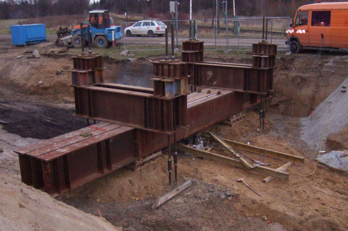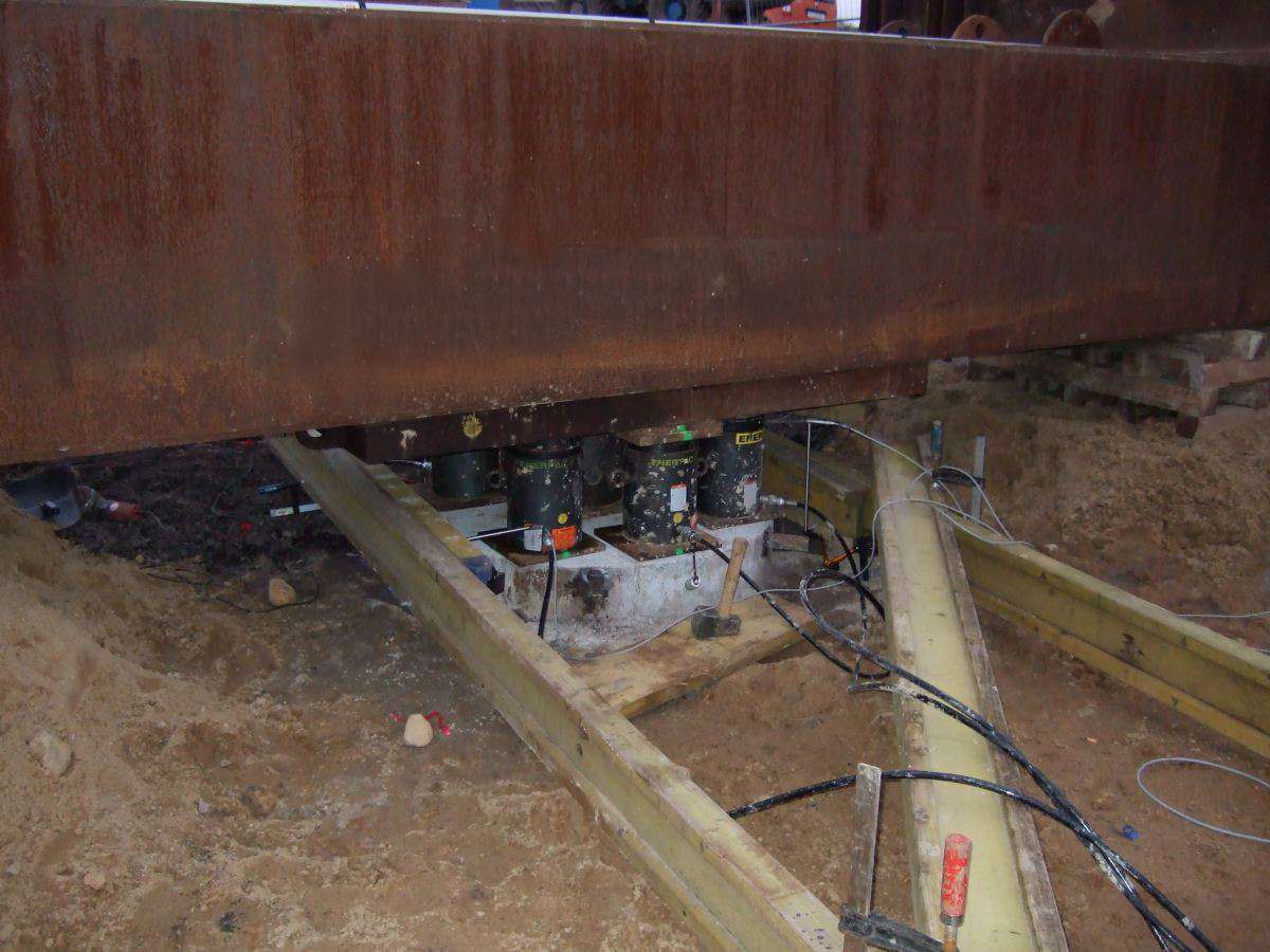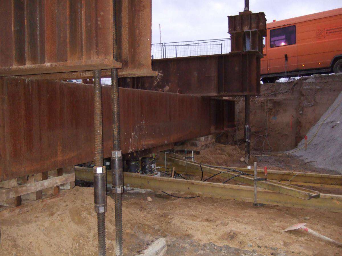 Zur Überprüfung der Tauglichkeit der geplanten Gründungsmaßnahmen ist an beiden Bauwerken eine axiale statische Probebelastung durchzuführen, die im Auftrag der PST Grundbau GmbH von der Ingenieurgemeinschaft Setzpfandt geplant und ausgeführt wurde. Den beeindruckenden Versuchsaufbau zum Übertragen von bis zu 12 MN Prüflast auf den Probepfahl sieht man auf den Bildern 3 und 4. Die Lastaufbringung auf den Probepfahl erfolgte über 7 hydraulische Pressen der Fa. Enerpac (Bild 5).