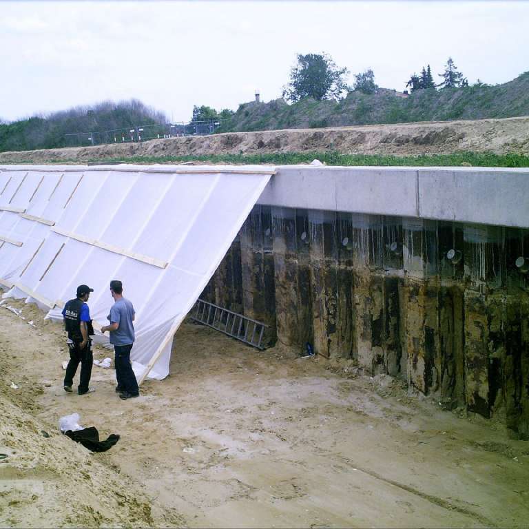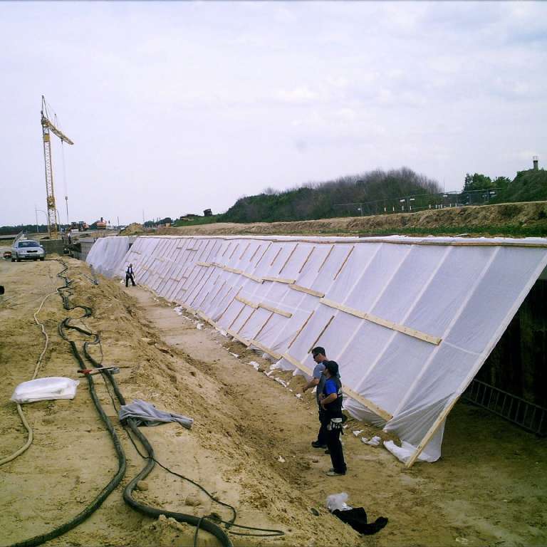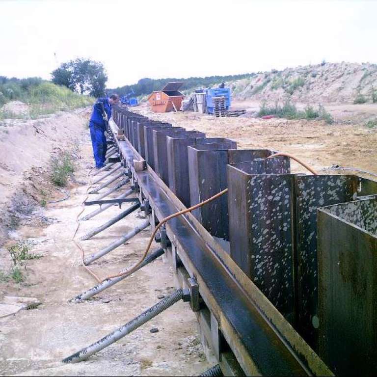 Es werden ferner 275 lfdm. Gurtung und 222 Stück Daueranker eingebaut. Die Spundwand wird direkt auf der Baustelle spritzverzinkt und deckbeschichtet.