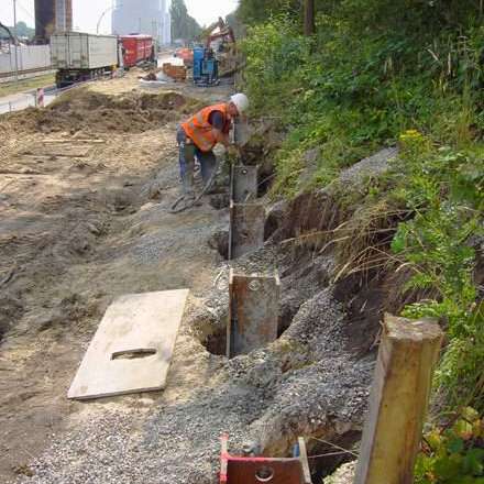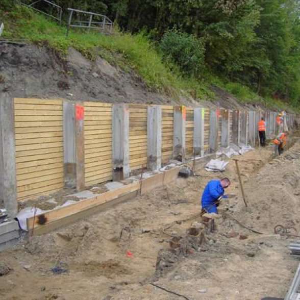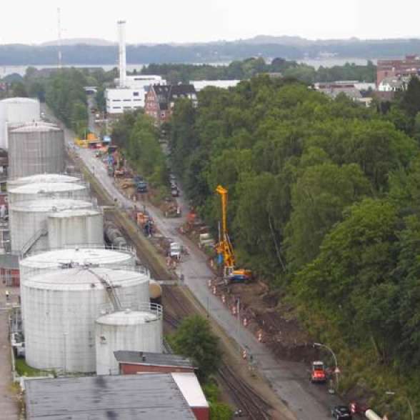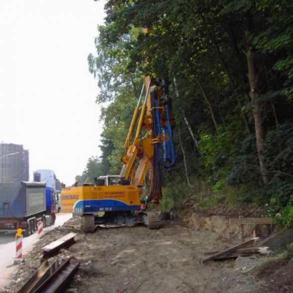 Im Auftrag der Landeshauptstadt Kiel wird die Uferstrasse (K32) am Nord-Ostsee-Kanal um- und ausgebaut. Dazu wird der angrenzende Hang auf einer Länge von 470 Metern dauerhaft gesichert. Die Sicherung erfolgt mit gebohrten Stahlprofilträgern, die im Endzustand in eine bewehrte Ortbetonwand integriert werden.
