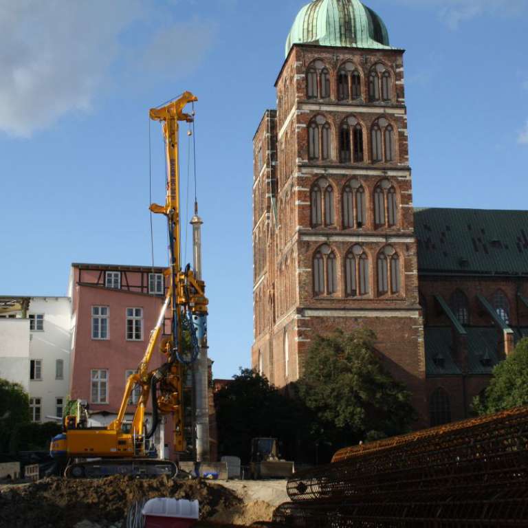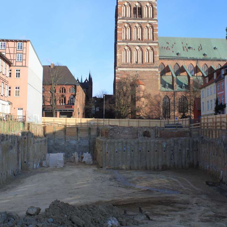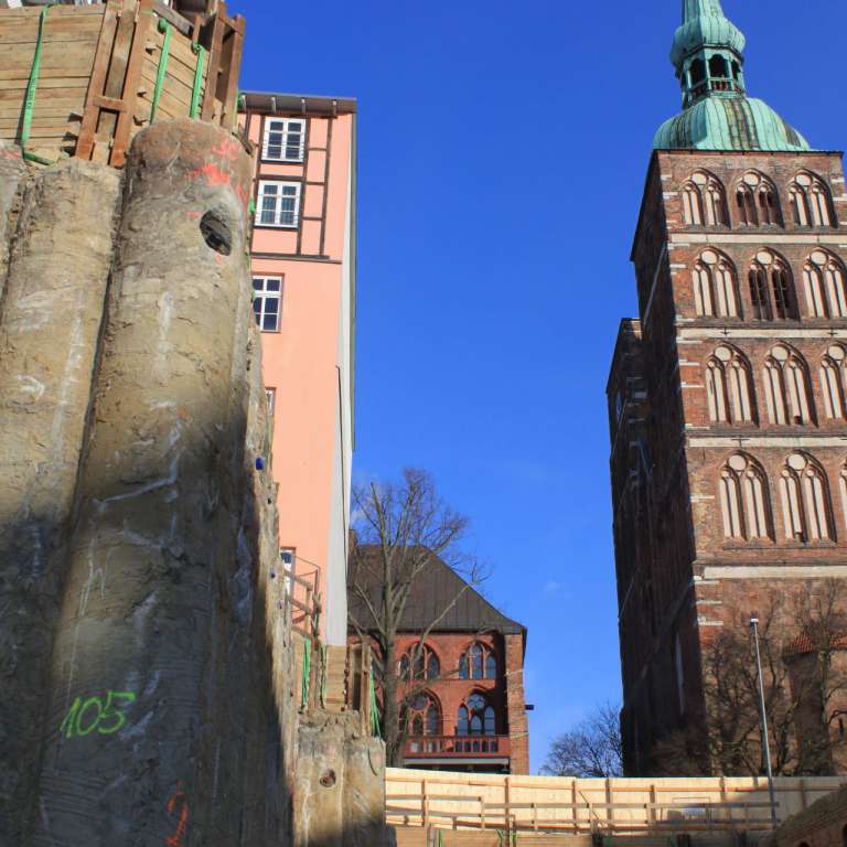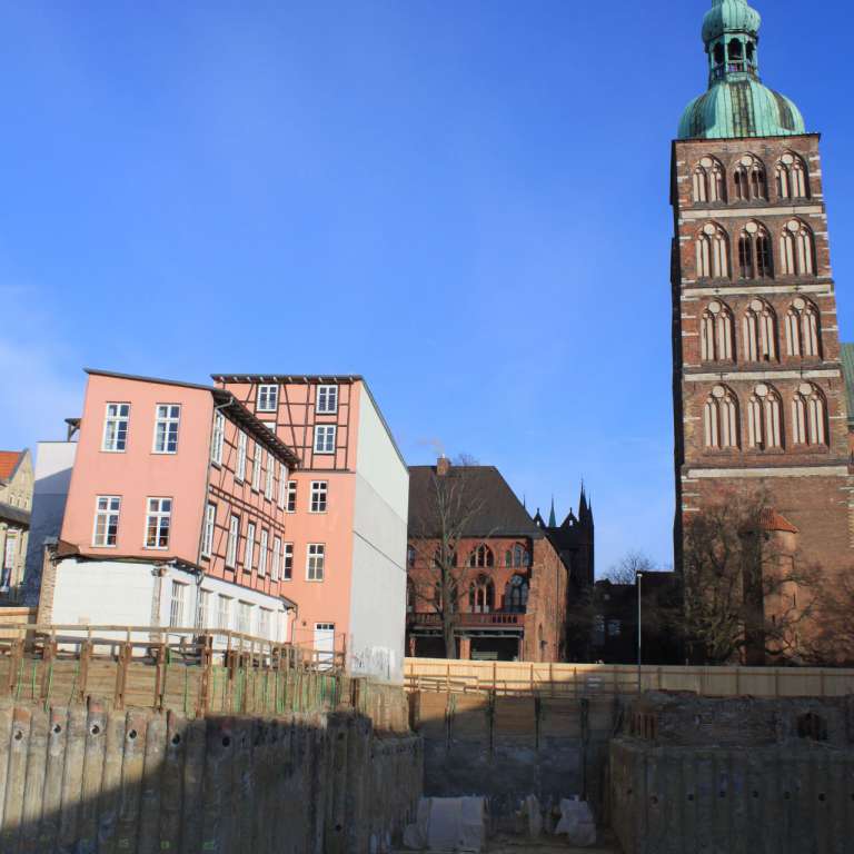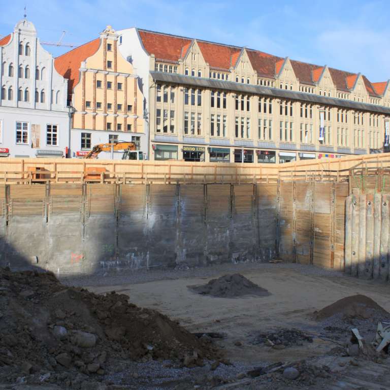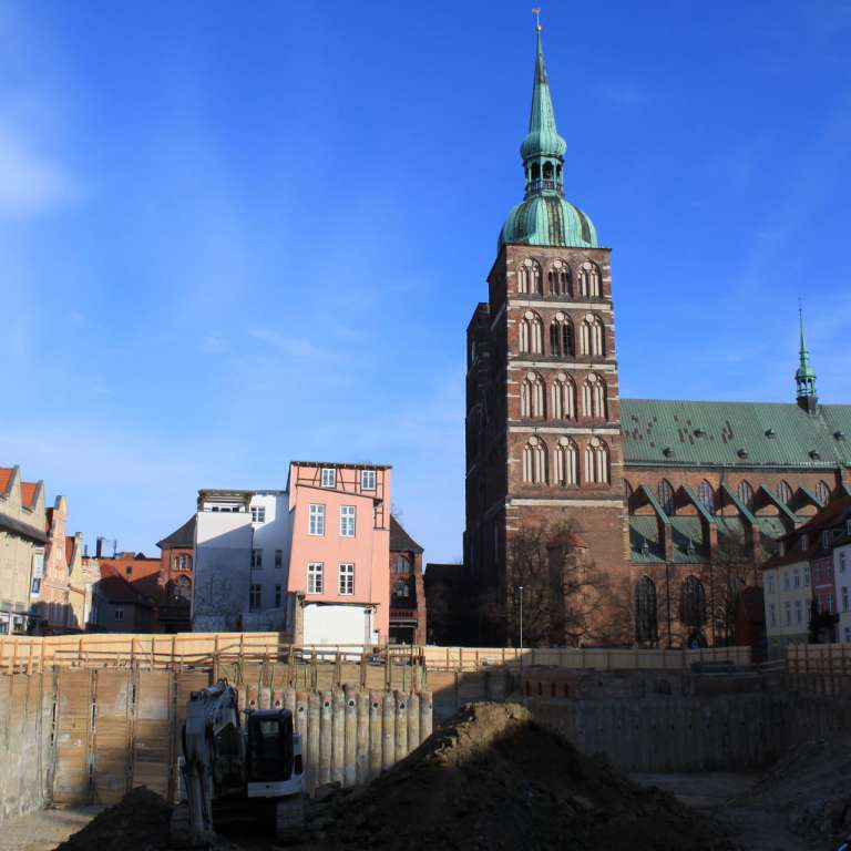 In der Stralsunder Altstadt (Quartier 17 Rathausplatz) baut die TLG Immobilien GmbH, Niederlassung Mecklenburg-Vorpommern einen Büro- und Wohnkomplex mit integrierter Tiefgarage.