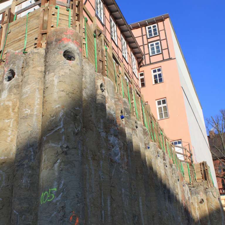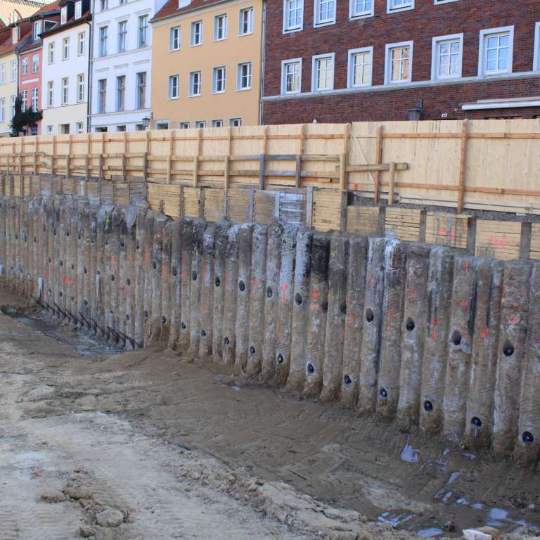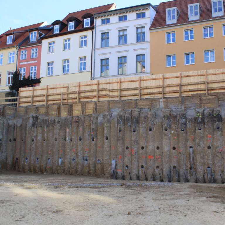 Die PST Grundbau GmbH ist mit der Erstellung der Baugrubensicherung beauftragt. Die Baugrubensicherung umfasst: