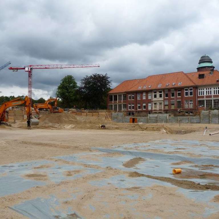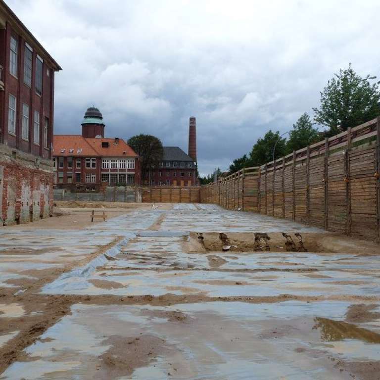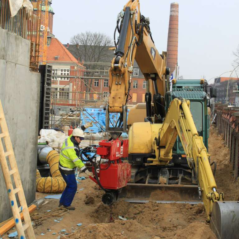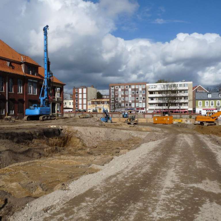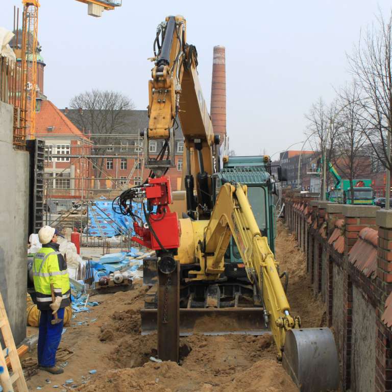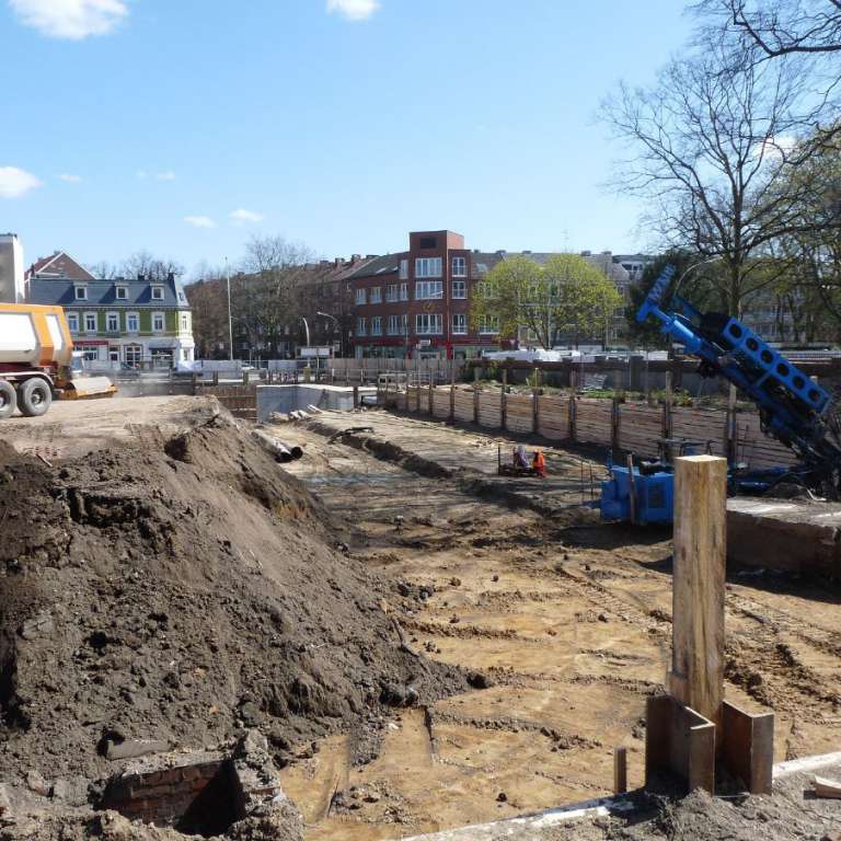 Die Baugrubenumschließung wird mit drei verschiedenen Spezialtiefbauverfahren durch die PST Grundbau GmbH in Arbeitsgemeinschaft mit der Gebrüder Kemmer GmbH (Erdarbeiten) realisiert: