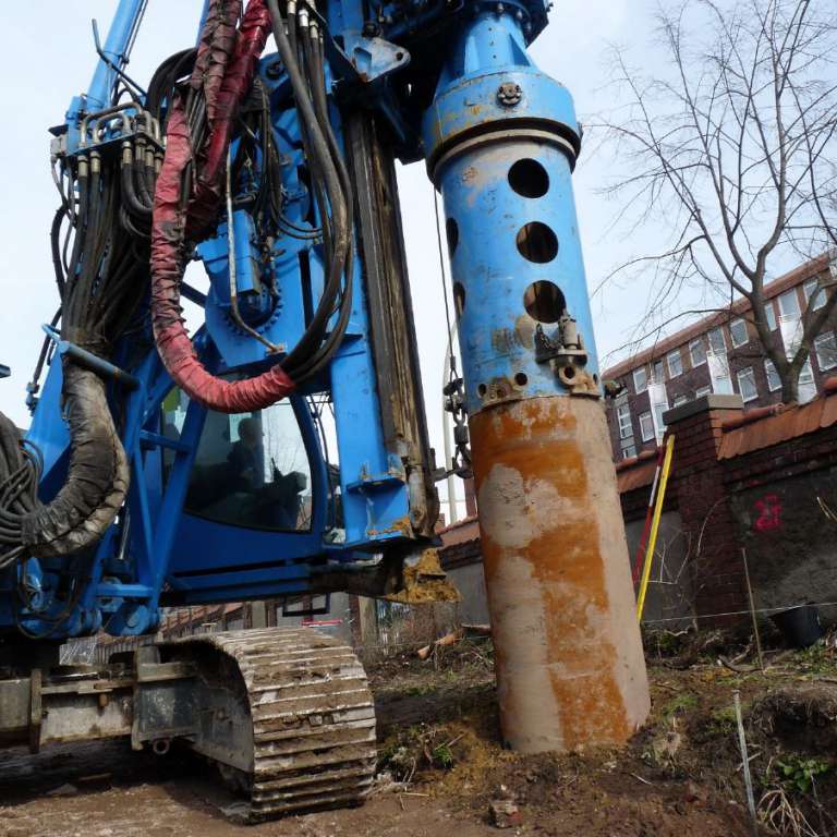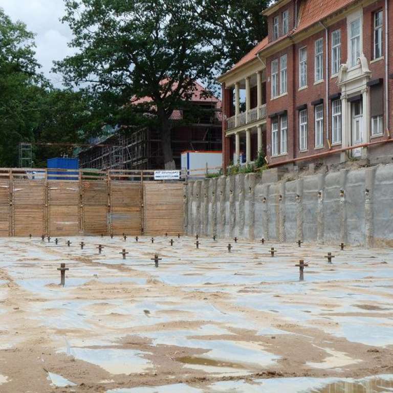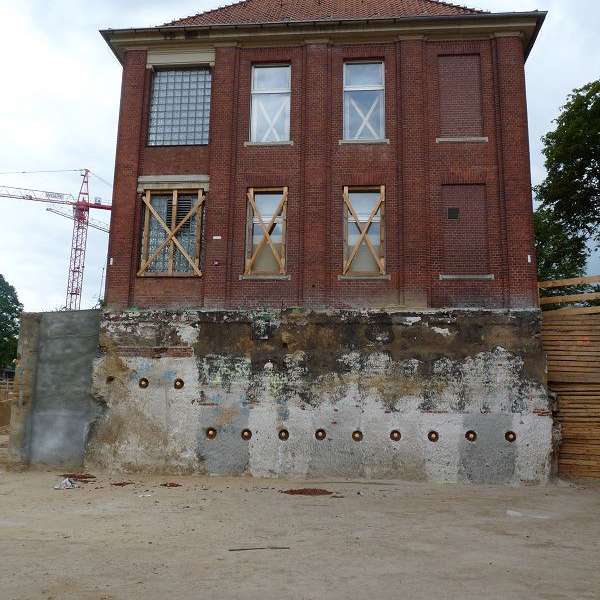 Hochdruckinjektionsarbeiten zur Herstellung einer rückverankerten HDI-Unterfangung der beiden östlichen Giebel der Bestandsgebäude