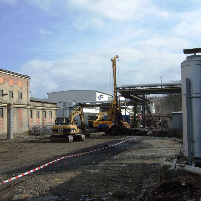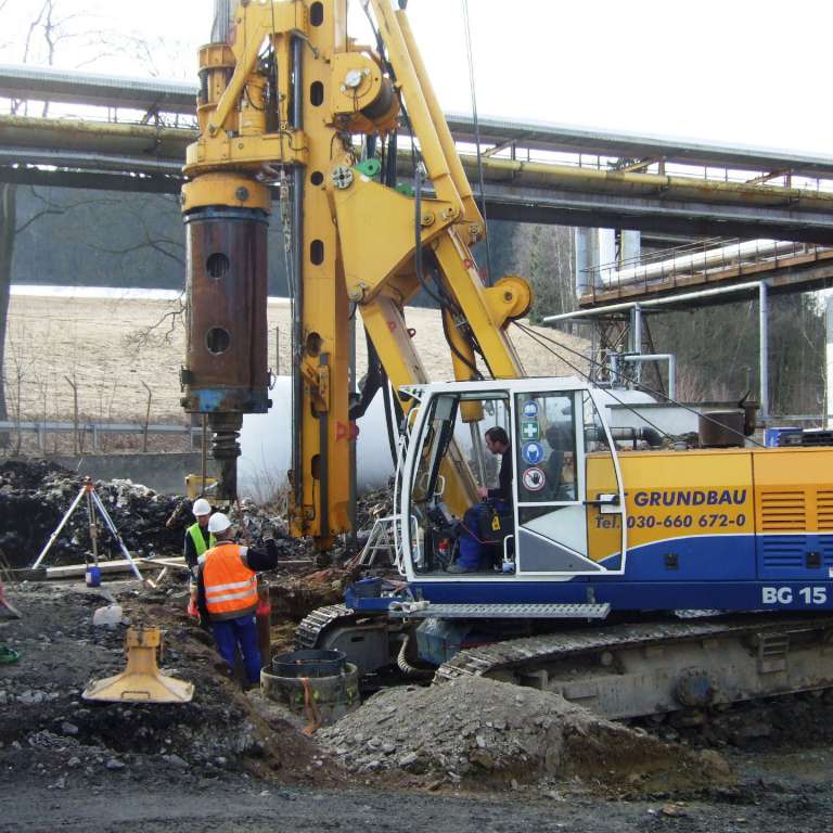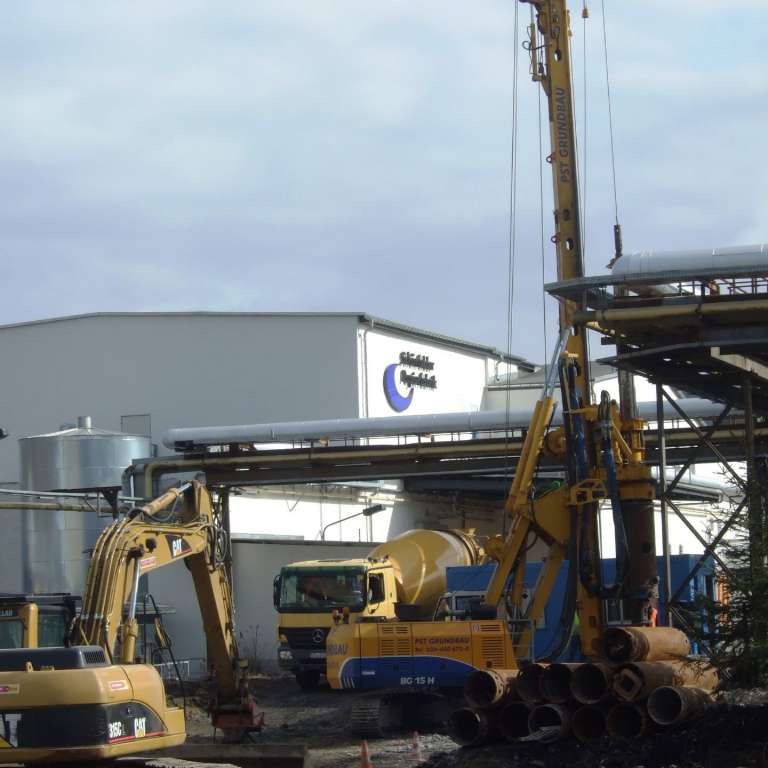 Die Schönfelder Papierfabrik baut auf dem Werksgelände in Annaberg-Buchholz (Erzgebirge) eine Deinking-Anlage zur Papieraufbereitung. Die PST Grundbau GmbH stellt hierfür ca. 260 Gründungspfähle, einbindend in Festgestein (Gneis), mit Pfahllängen von bis zu 8 m und Pfahldurchmessern von 900 und 620 mm her. Zum Einsatz kommt unsere eigene Drehbohranlage vom Typ Bauer BG15H.