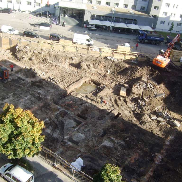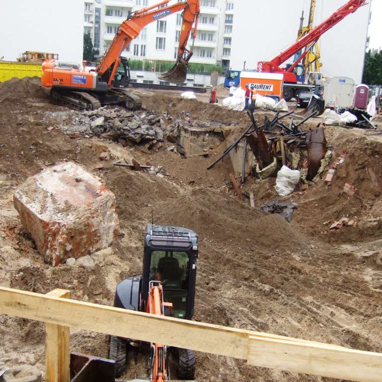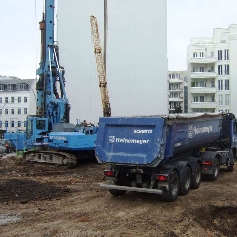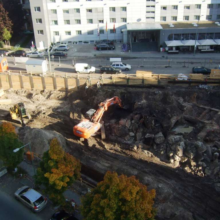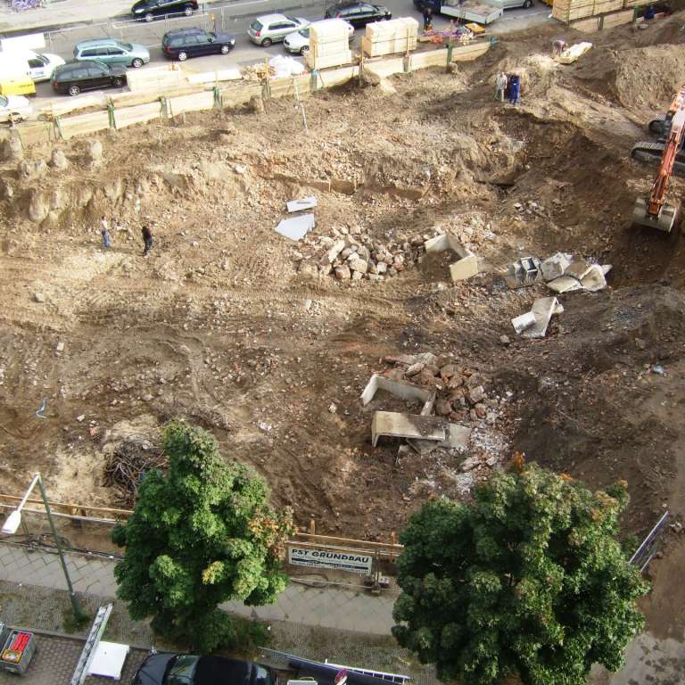 Infolge der früheren Nutzung des Grundstücks als Industriestandort, z.B. als Buchdruckerei, Silbermanufaktur, Bürstenfabrik und Beleuchtungskörperfabrik besteht der Aushub nahezu vollständig aus Bauschutt und umfangreichen massiven Bebauungsresten, Altfundamenten und Gründungskörpern, die fast durchweg bis zur geplanten Bauwerkssohle, teilweise aber auch beträchtlich tiefer reichen.
