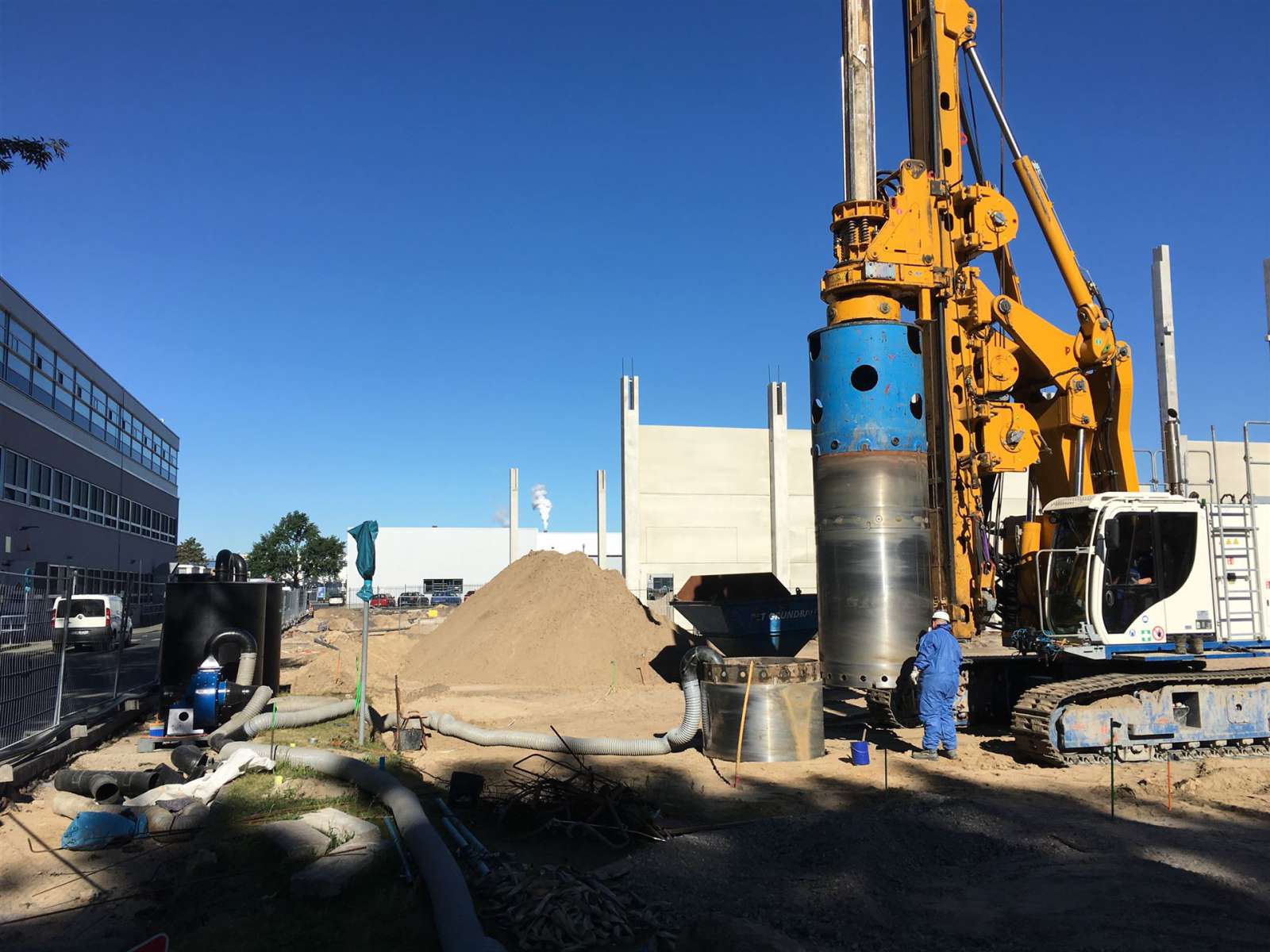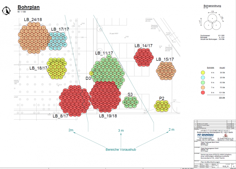 Nach intensiver Beratung des Bauherrn und Ausarbeitung verschiedenen Ausführungsvarianten, wurde die PST Grundbau GmbH in Arbeitsgemeinschaft mit der Firma Philipp Dunkel GmbH & Co. KG im Juni 2018 von der Thelen Technopark Berlin GmbH mit der Durchführung der Bodensanierungsmaßnahme Nonnendamm 55 in 13627 Berlin beauftragt. Im Zeitraum Juni bis September 2018 wurden hierfür 322 Bohrungen im Durchmesser 1.500 mm mit Bohrtiefen 4 – 8 m abgeteuft. Der ausgebohrte und im Wesentlichen mit BTEX und LHKW belastete Boden wurde in gedeckelte Sicherheitscontainer verbracht. Der kontaminierte Boden wurde in den Deckelcontainern mittels Vakuum entwässert und täglich abgefahren. Die kontaminierten Wässer wurden einer bauseitigen Grundwasserreinigungsanlage übergeben. Während der Bohrarbeiten wurde an den Emissionsquellen eine Luftabsaugung mit einer Leistung von 1.200 m3/h betrieben und die abgesaugte Luft über eine 2-stufige Luftaktivkohlerfilterung gereinigt. Die Arbeiten konnten termingerecht für den nachfolgenden Neubau einer Fertigungshalle abgeschlossen werden.