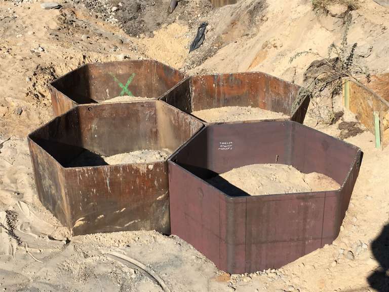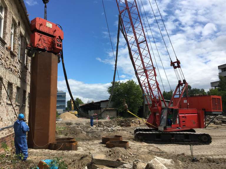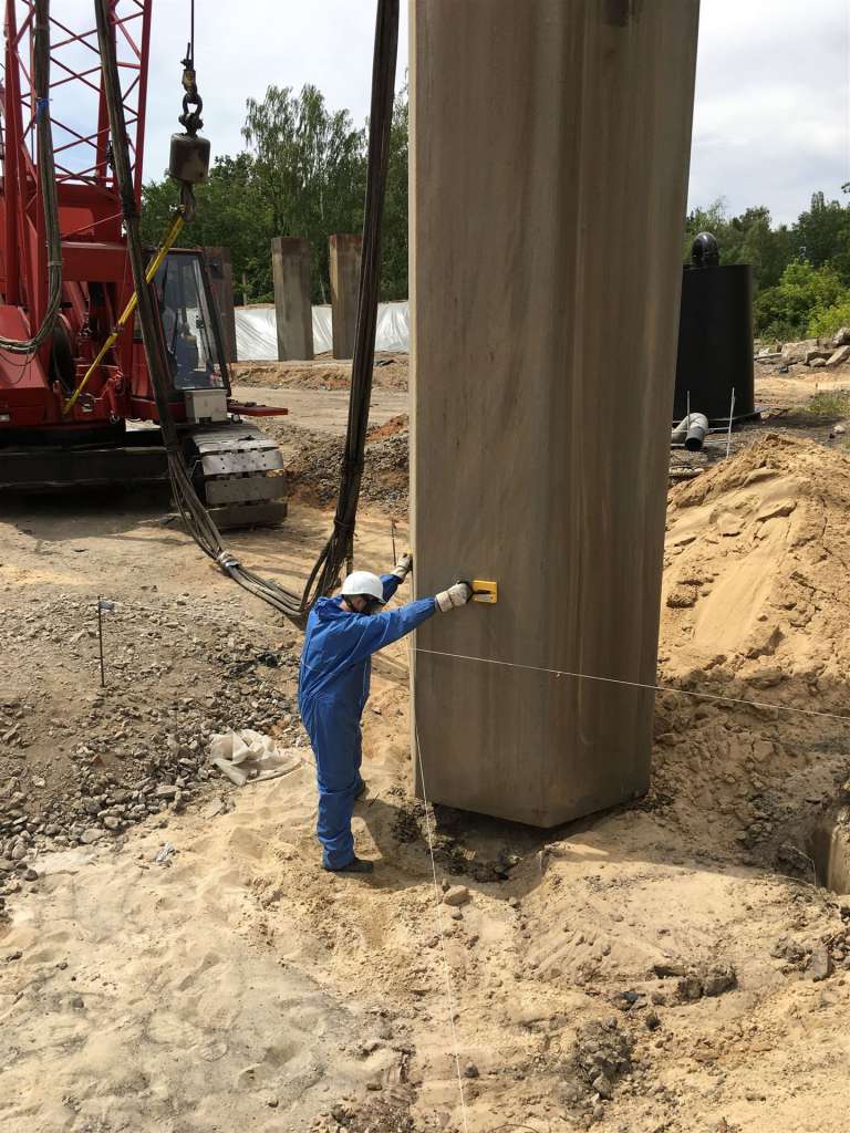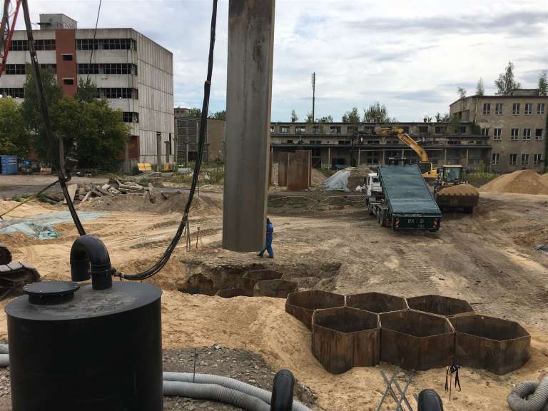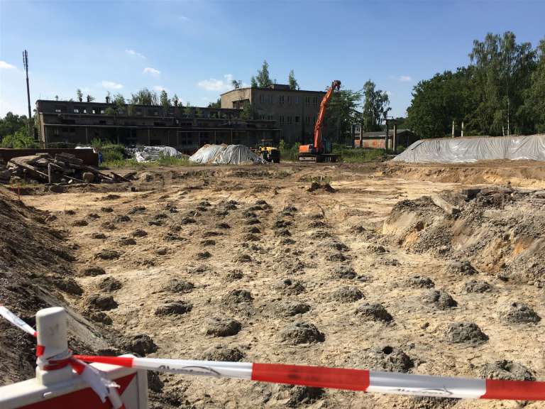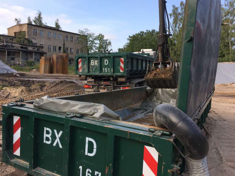 Nach einer Oberflächensondierung des Geländes auf Kampfmittel erfolgte ein Voraushub um rund 1 Meter. Von diesem Niveau aus erfolgten die Kampfmittelsondierbohrungen im Raster der späteren Wabenelemente bis 6 m unter Ursprungsgelände. Im Anschluss konnte die Arbeitsebene mittels RC-Material erstellt und mit dem Wabenaushub begonnen werden. Ausgeführt wurden 436 Stück Waben mit Aushubtiefen von 3,18 bis 7,23 m und einer Gesamtkubatur von 4.648 m³. Das Material wurde in gedeckelte Sicherheitscontainer verbracht und auf einer erstellten asphaltierten Entwässerungsfläche an eine Unterdruck-Containerentwässerung angeschlossen. Das dabei anfallende kontaminierte Wasser wurde einer bauseits betriebenen Grundwasserreinigungsanlage übergeben. Begleitet wurden die Aushubarbeiten durch eine Luftabsaugung an den Wabenköpfen und an den in Beladung befindlichen Deckelcontainern mit nachgeschalteter mehrstufiger Luftreinigung.